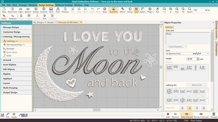 Once you try Hatch Embroidery, there is a very good chance you will fall in LOVE with it. A good example is our LOVE–ly graphic designer, Laura, who is usually busy creating the beautiful artwork you see in our emails, blog articles and on social media. In between doing her design work, Laura has been experimenting with Hatch Embroidery Digitizer and created a couple of Valentine's Day designs. She really enjoyed using the professionally digitized fonts that come included with the software and she created a few Valentine’s themed designs that you can access by clicking the button at the end of this article.