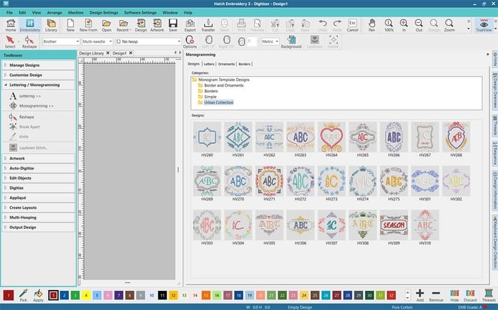 Hatch Digitizer comes with 124 preloaded fonts, 90 monogram templates, 400 ornaments, 375 motifs, and 100 embossed fills, giving you endless options for creative designs.